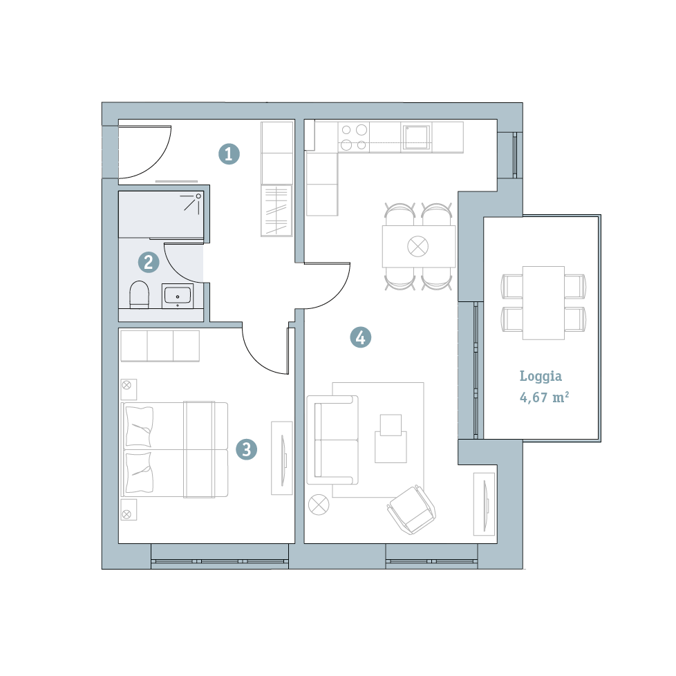 Zweizimmerwohnung mit Loggia / Harleblick. EG rechts, 57,35 m2