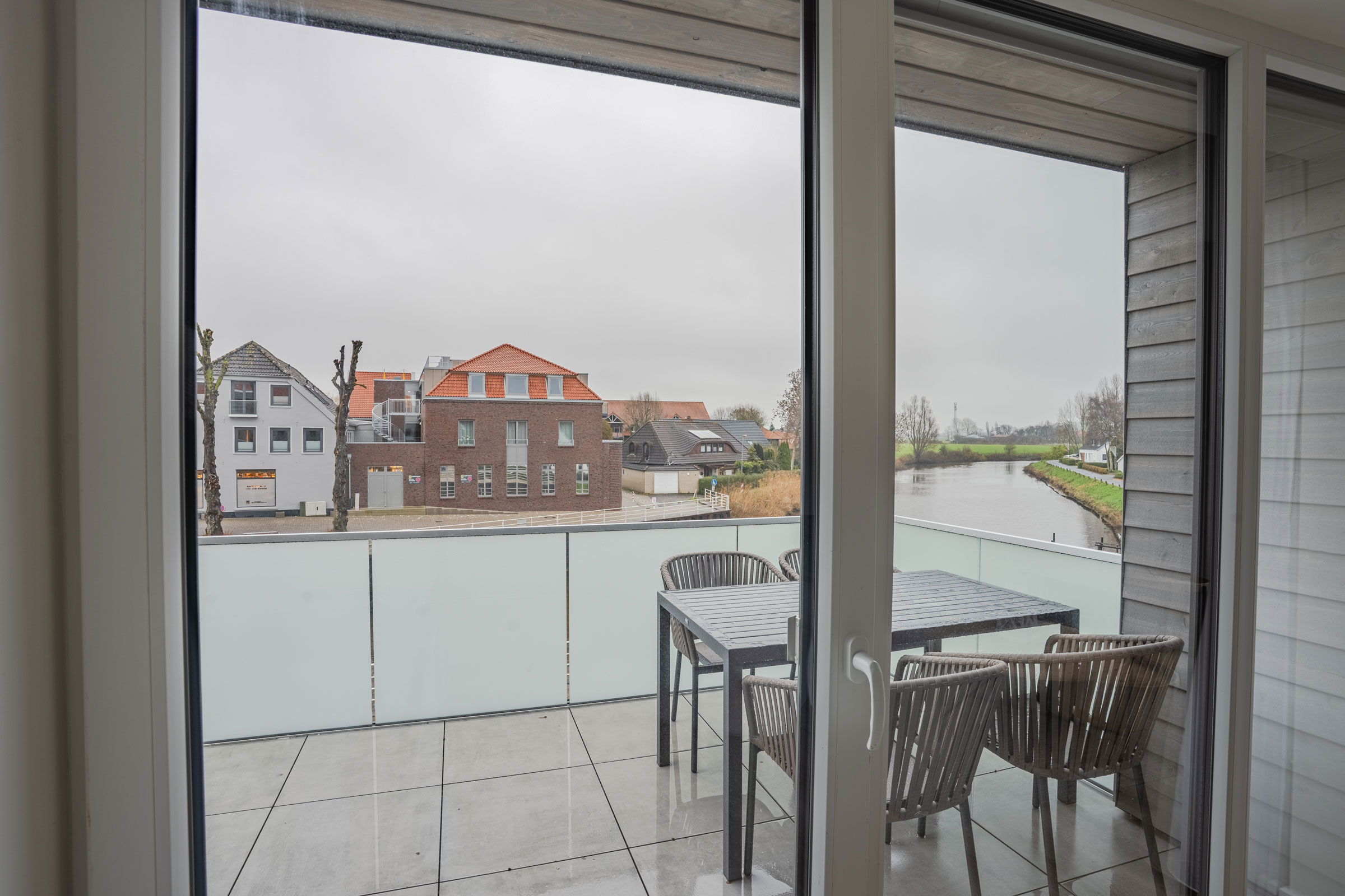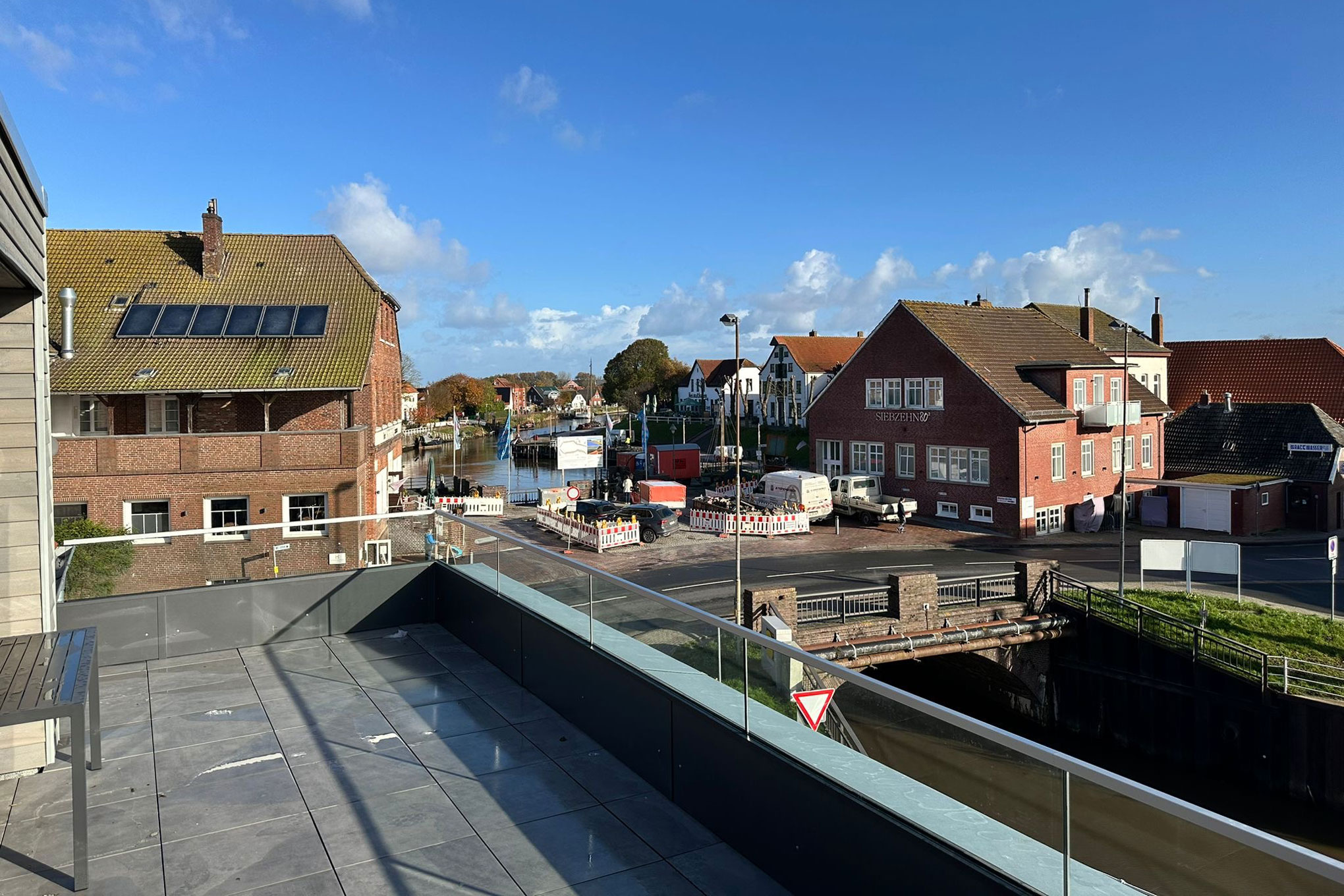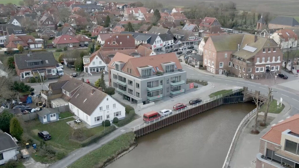 Letzte Neubauten im Nordseeheilbad mit Blick auf die Harle und den Museumshafen.